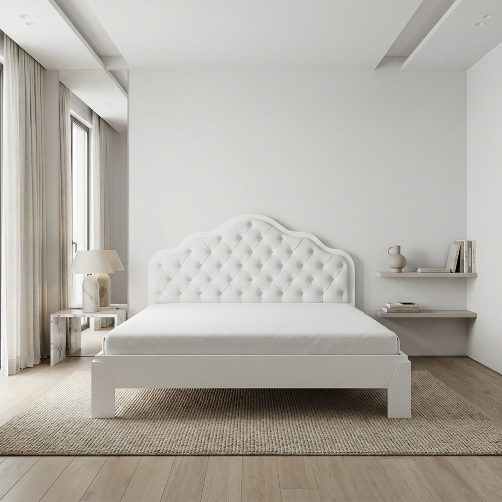Корпус кровати "Версаль" изготовлен из ЛДСП. Основание под матрас ДСП, которое выдерживает большой вес и нагрузки. Спинка с мягкой накладкой в виде каретной стяжки со стразами. Материал обивки микровелюр, пуговицы стразы. Кровать выполнена в классическом стиле, придаст элегантности вашей спальни. Эта модель кровати представлена в нашем магазине в различных цветах вы можете приобрести как готовую, так и под заказ по своим размерам.